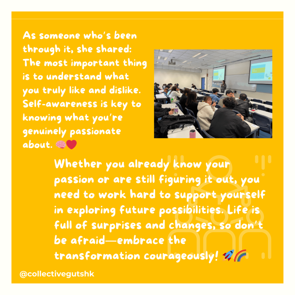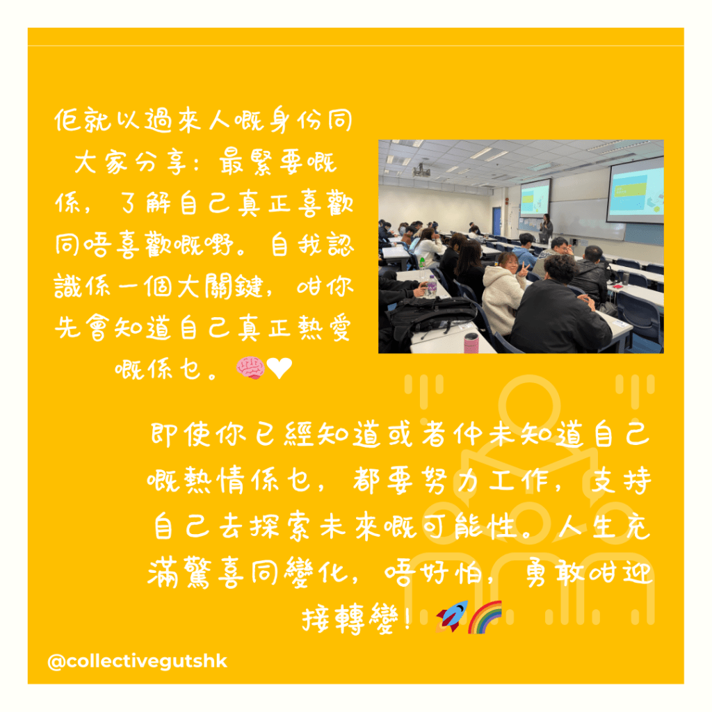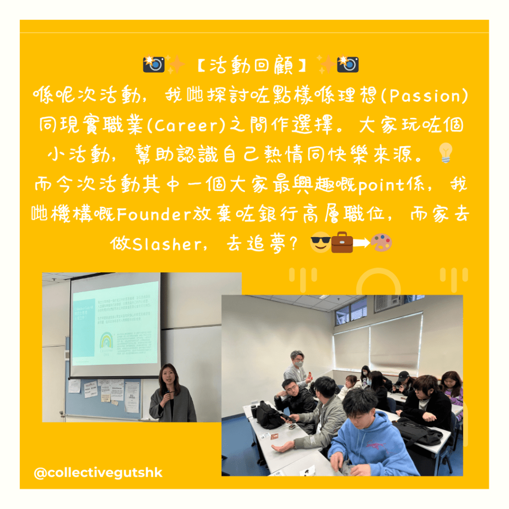 On February 27th, we went to Sha Tin IVE and had a sharing session with a group of young people. We explored whether a life without dreams really makes you a “salted fish” and discussed how to find out what you truly like to do. Do you know what your passion is?