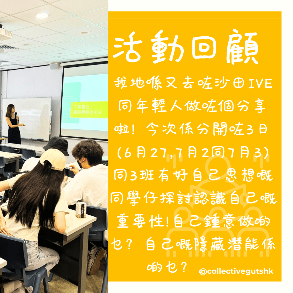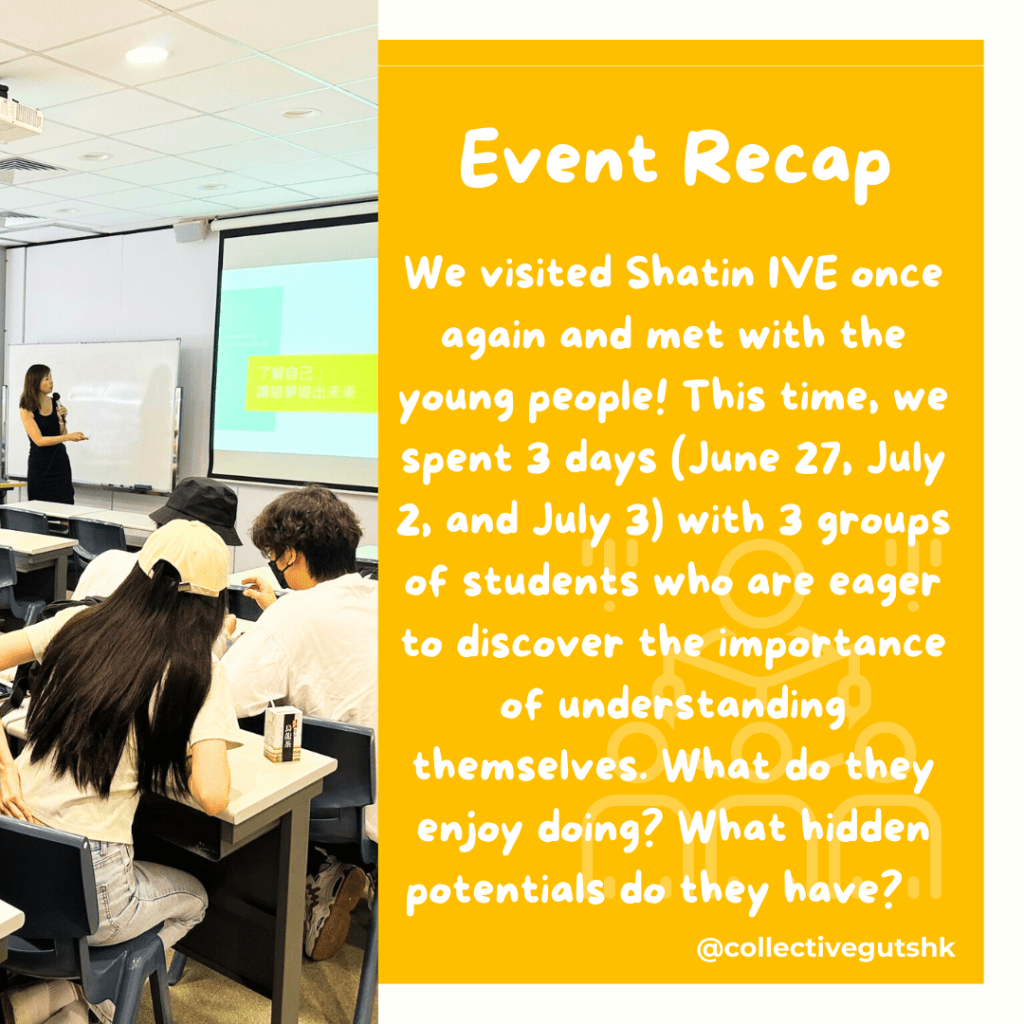 We visited Shatin IVE once again and met with the young people! This time, we spent 3 days (June 27, July 2, and July 3) with 3 groups of students who are eager to discover the importance of understanding themselves. What do they enjoy doing? What hidden potentials do they have?