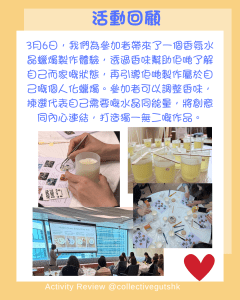 On March 6, we brought a scented crystal candle-making experience to our participants, helping them understand their current state through fragrances. We guided them in creating their own personalized candles. Participants could adjust the scents and select crystals and energies that represented their needs, connecting creativity with their inner selves to craft unique creations.